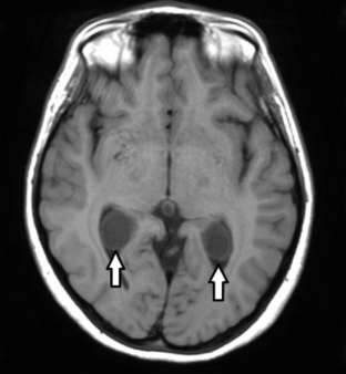 RM de cerebro, cortes axiales ponderados en T1. Se visualiza en los atrios ventriculares (flechas) imágenes quísticas redondeadas, que expanden los plexos coroideos. Las mismas son compatibles con xantogranulomas de plexos coroideos.