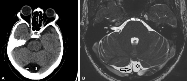 (A-B) TC, corte axial de cerebro (A). Aumento del diámetro de la cisterna Magna (*). Nótese la presencia de estructuras vasculares venosas en su interior (flecha). RM, cortes sagital axial ponderado en T2 (B) se objetiva aumento de los diámetros de la cisterna Magna (*) atravesada por estructuras vasculares (flecha).