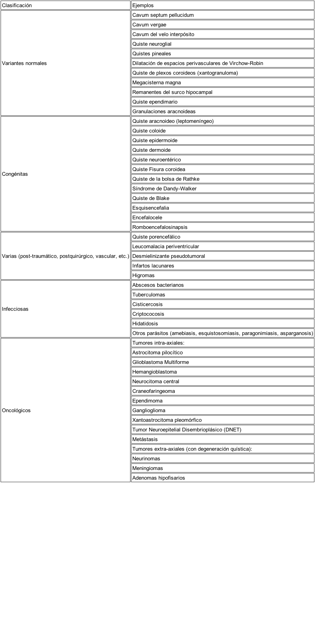 Una imagen quística puede definirse como una estructura redondeada rellena de líquido o de contenido semisólido fluido, revestida por un epitelio.1,2 El contenido puede ser homogéneo o heterogéneo, derivados endo, ecto o mesodérmicos. La localización puede ser intracerebral (o intraaxial) o extraaxial (dentro del cráneo, pero fuera del encéfalo). De presentación congénita o adquirida, pueden subclasificarse en benignos o malignos según su naturaleza.1,2 Su forma de presentación varía siendo sintomáticos por efecto de masa, comprimiendo estructuras vecinas pudiendo ocasionar déficits neurológicos focales o hipertensión endocraneana, o asintomáticos, reportándose como un hallazgo.3 Podemos clasificar a los quistes según su etiología (►Tabla 1).4,5,6