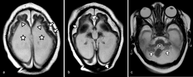 Imágenes de resonancia magnética (RM) en plano axial potenciadas en T2. La imagen (a) muestra ventriculomegalia severa no hipertensiva (estrellas blancas), asociada a una importante disminución en el volumen de la sustancia blanca fronto-parietal (punta de flechas blancas) y polimicrogiria en la corteza frontal (flechas blancas). En la figura (b), se evidencia lisencefalia a nivel de la corteza frontal, insular y témporo-occipital bilateral (flechas blancas), mientras que la imagen (c) muestra dilatación del IV° ventrículo (estrella blanca), asociada a hipoplasia de ambos hemisferios cerebelosos (flechas).