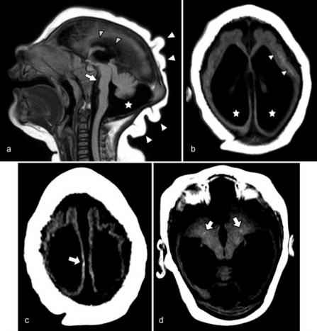 Imágenes de RM en plano sagital potenciadas en T1. La imagen (a) muestra desproporción cráneo-facial asociada a microcefalia, disgenesia del cuerpo calloso (punta de flechas grises), megacisterna magna (estrella blanca), hipoplasia protuberancial (flecha blanca) y redundancia de pliegues cutáneos occipitales (punta de flechas blancas). En las imágenes en plano axial potenciadas en T1 (b), (c) y (d), se muestran áreas puntiformes hiperintensas de distribución cortical y subcortical a nivel frontal y parietal al igual que a nivel infratentorial, compatibles con calcificaciones (flechas blancas).