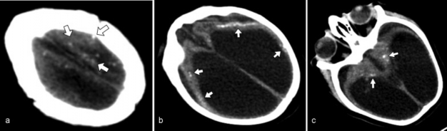 En imágenes de tomografía computada en plano axial (a), (b) y (c) se observan múltiples calcificaciones corticales y subcorticales a nivel supra e infratentorial (flechas blancas), que se correlacionan con los hallazgos de las ►Figs 2b-d.