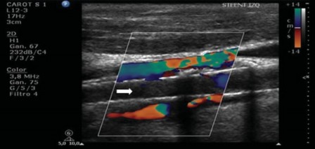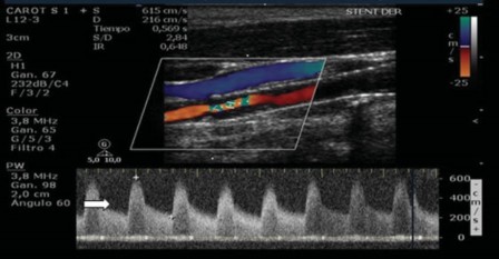 En los pacientes con stent, los criterios de VPS deben ser corregidos. Algunos reportes indican que luego de la angioplastia carotídea se altera la compliance del vaso nativo por lo cual varían las velocidades. Hay acuerdo en que las mismas se ven aumentadas, lo cual tiende a confundir y a sobreestimar la estenosis. En el análisis de Ringer y col., se evaluaron los pacientes siete días posterior a la colocación de stent, usando el método estándar de VPS, encontrando sobre un total de 114 pacientes, 40 con velocidades elevadas, con criterios de reestenosis, que posteriormente en control angiográfico notuvieron evidencia deestenosis mayor al 50%.16