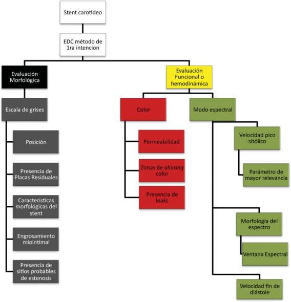 Para el seguimiento del stent, el EDC es el método de primera intención, por inocuidad, accesibilidad y rapidez. También es útil para el seguimiento, ya que permite detectar la mayoría de las complicaciones siendo el método de elección en esos pacientes. Realizado por exploradores expertos y con los equipos adecuados, el ECD presenta en relación a la ASD sensibilidades superiores al 95% para la detección o exclusión de estenosis significativa en la ACI con valores predictivos negativos por encima también del 95%.10 Para una adecuada realización se debe seguir un protocolo determinado, evaluando el stent en escala de grises, en modo color y Doppler pulsado (►Esquema 1).