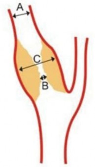 Método de medición del grado de estenosis, para angiotomografía computada (Angio-TC) y angiografía por resonancia magnética (Angio-RM), según los criterios NASCET. (A) Sector de arteria de calibre normal distal a la estenosis. (B) Sitio de máxima estenosis. (C) Diámetro total de la arteria en el sector de la estenosis.