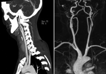 La Angio-TC y la Angio-RM son métodos complementarios, no invasivos, para estudiar la enfermedad carotídea. Además, aportan información anatómica de la porción intracraneal e intratorácica de los vasos del cuello. Ambas se basan en los criterios NASCET para la medición del grado de estenosis y son métodos de elección y complementarios en determinados pacientes (►Figs. 1 y 2).4 Esos criterios consisten en correlacionar el diámetro de la arteria carótida interna (ACI), en su sitio de máxima estenosis, con el de su segmento distal normal, donde ambas paredes se vuelven paralelas.