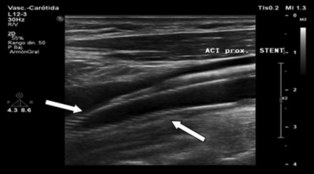 Resumen: Los ataques cerebrovasculares (ACV), representan un problema mayor en salud y son una causa importante de discapacidad en todo el mundo. La estenosis u oclusión carotídea aterosclerótica causa alrededor del 20% de las isquemias cerebrovasculares.1 Los ACV en los enfermos con estenosis carotídea se producen, en la mayoría de los casos, por la aparición de embolismos distales de trombo formado en la placa, oclusión trombótica aguda debido a rotura de la placa, o bien secundarios a las alteraciones hemodinámicas atribuibles a la estenosis, la cual produce disminución de la perfusión cerebral por el hipoflujo, en casos de estenosis críticas o suboclusivas. El tratamiento de la patología carotídea ha evolucionado de forma considerable a lo largo de los últimos años. Existen dos tratamientos invasivos para la estenosis carotídea significativa, que consisten en el abordaje quirúrgico con endarterectomía o tratamiento por vía percutánea con angioplastia y colocación de stent. En nuestra institución se realizaron, en el periodo comprendido entre marzo de 2013 y junio de 2017, aproximadamente 100 angioplastias carotídeas con colocación de stent. Todas fueron valoradas con ecografía Doppler color (EDC) al mes, a los seis meses y al año (en casos no complicados). En esta revisión bibliográfica es nuestra intención desarrollar las indicaciones, aplicaciones, hallazgos normales y patológicos en el examen de EDC en la evaluación de un paciente con stent carotídeo.