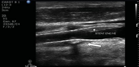 Abstract: Acute stroke represents a major problem in health and is a major cause of disability worldwide. Atherosclerotic carotid stenosis or occlusion causes around 20% of cerebrovascular ischemias.1 Stroke in patients with carotid stenosis occurs, in most cases, due to embolisms of thrombus formed in the plaque, acute thrombotic occlusion due to rupture of the plaque, or secondary to hemodynamic alterations, attributable to stenosis, which produces decreased cerebral perfusion by low flow, in cases of critical or sub occlusive stenosis. The treatment of carotid disease has evolved considerably over recent years. There are two invasive treatments for significant carotid stenosis, which consist of the surgical approach with endarterectomy or percutaneous treatment with angioplasty and stenting. In our institution, in the period between March 2013 and June 2017, ~100 carotid angioplasties with stent placement were performed. All were assessed with color Doppler ultrasound (DUS) at month, six months and one year (in non complicated cases). In this literature review it is our intention to develop the indications, applications, normal and pathological findings in the DUS examination in the evaluation of a patient with carotid stent.
