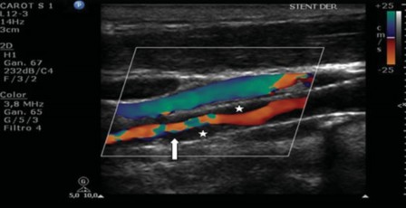 La ecografía Doppler color (EDC) constituye uno delos métodos de elección para la evaluación de los stent carotídeos. Por ese motivo, resulta importante esta revisión, la cual demuestra sus hallazgos normales y patológicos, logrando una adecuada valoración de pacientes con stent carotídeo. Así podrán obtenerse los mejores resultados del método y disminuir sus errores.