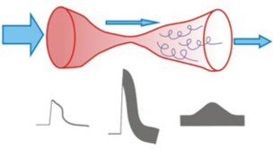 Representación esquemática donde se observan las diferentes morfologías de onda. En el sector previo a la estenosis, donde el flujo es laminar, se obtienen morfologías de onda normales con conservación de la ventana espectral (flecha). En el sitio de la estenosis la onda adquiere alta velocidad y pérdida de la ventana espectral (estrella). Finalmente posterior a la estenosis se observa un flujo de tipo turbulento, con baja velocidad y disminución del tiempo de aceleración (cabeza de flecha).
