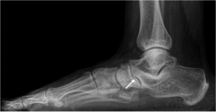 La articulación anormal entre los huesos calcáneo y escafoides puede observarse en las radiografías laterales del pie en bipedestación, siendo aún más evidente en proyecciones oblicuas internas a 45°.5