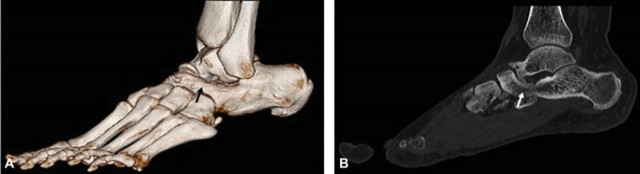 Tomografía computada con reconstrucción 3D (A) y reconstrucción multiplanar (MPR) en plano sagital de tobillo (B). Barra ósea tarsal calcáneo-escafoidea (flechas).