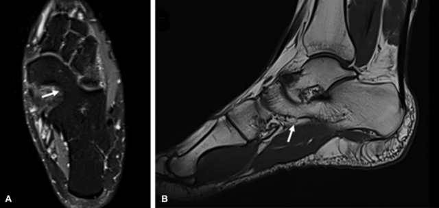 Resonancia magnética de tobillo en plano axial STIR (A) y en plano sagital potenciada en T1 (B). Barra ósea tarsal calcáneo-escafoidea.