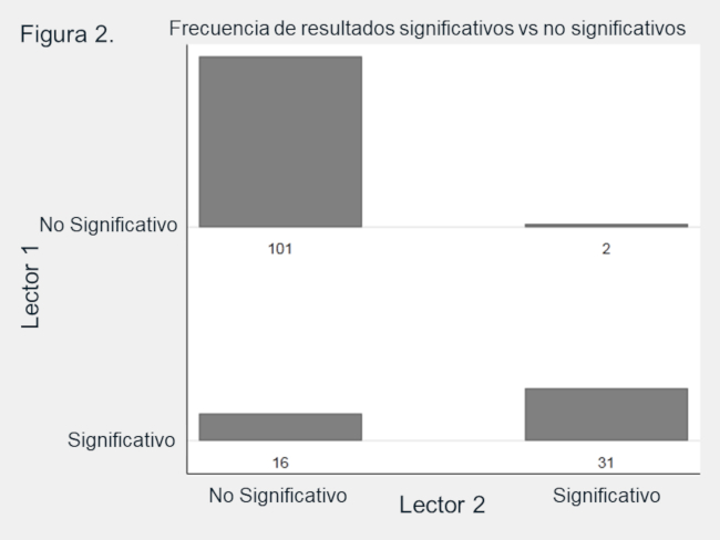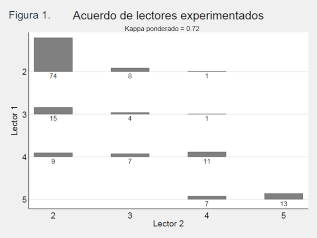 Gráfico que muestra la distribución de los resultados de las interpretaciones de los lectores experimentados (cinco y cuatro años respectivamente), con un kappa ponderado de 0,72 (concordancia importante).