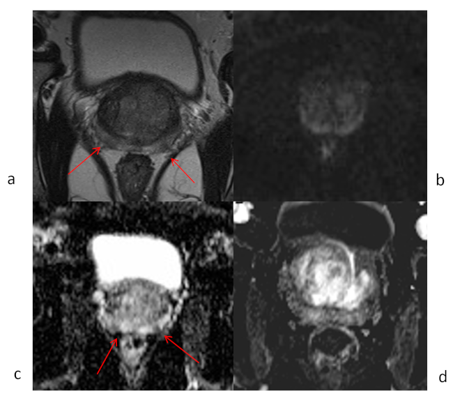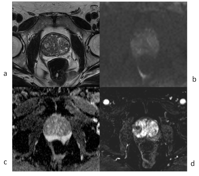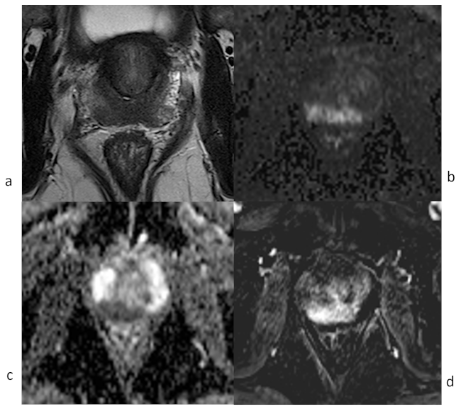 Paciente de 56 años. APE 5,7 ng/ml (a) T2FSE WI, (b, c) DWI y mapa ADC, (d) perfusión (DCE). Signos de hiperplasia de la zona de transición con nódulos adenomatosos. PI-RADS 2, existiendo acuerdo entre los tres lectores.