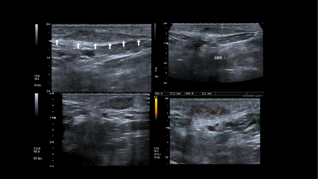 Ecografía de región plantar del pie. A nivel de la zona dolorosa en el arco interno plantar, se observa una formación sólida, hipoecogénica, de morfología fusiforme, que mide 17 mm de extensión y 3mm de espesor, ubicada en la profundidad del tejido celular subcutáneo en íntima relación a la fascia plantar (flechas blancas). La misma muestra señal al Doppler color en su interior.