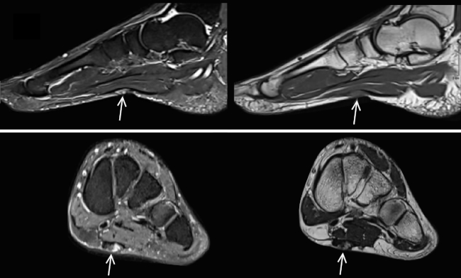 Resonancia magnética. (A) Secuencias sagitales STIR y T1. (B) Secuencias axiales DP FS Y T2. Se visualiza a nivel del margen medial de la fascia plantar, en su tercio medio-anterior, área de engrosamiento fusiforme predominantemente isointensa en ponderaciones T1 y T2, con áreas hiperintensas en secuencias con saturación grasa y STIR. La imagen descripta mide aproximadamente 17 mm de extensión longitudinal, 3 mm de espesor y 16 mm de diámetro transversal (flechas).