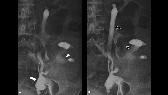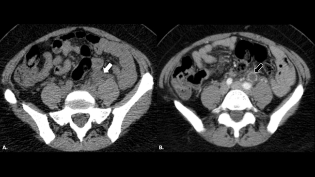 Paciente con nefrectomía izquierda por infección del tracto urinario (ITU) y litiasis a repetición. TC de abdomen sin contraste en corte axial (a) donde se reconoce proceso inflamatorio retroperitoneal izquierdo, de difícil caracterización (flecha blanca). TC de abdomen con contraste endovenoso en corte axial (b) que muestra una estructura tubular dilatada retroperitoneal izquierda, con refuerzo de sus paredes y cambios inflamatorios regionales, compatible con empiema del muñón ureteral (flecha negra).