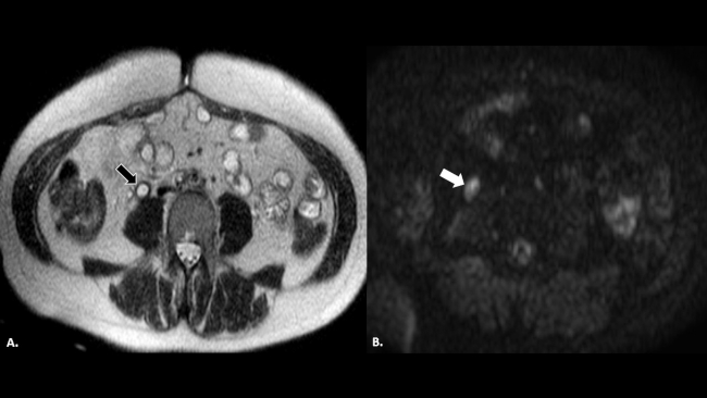 Paciente con nefrectomía derecha por implante pelviano secundario a un carcinoma de cérvix. (a) RM de abdomen en secuencia ponderada en T2, donde se reconoce uréter derecho dilatado, de paredes engrosadas con contenido líquido en su interior (flecha negra). En la secuencia en difusión del mismo paciente (b), se identifica inflamación del uréter remanente en secuencias de difusión (flecha blanca).