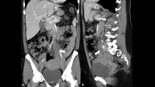Reconstrucciones tomográficas en (a) coronal y (b) sagital del caso descripto en la ►Figura 1. Se reconoce la dilatación del uréter remanente con refuerzo de sus paredes a lo largo de todo su trayecto (flechas blancas).