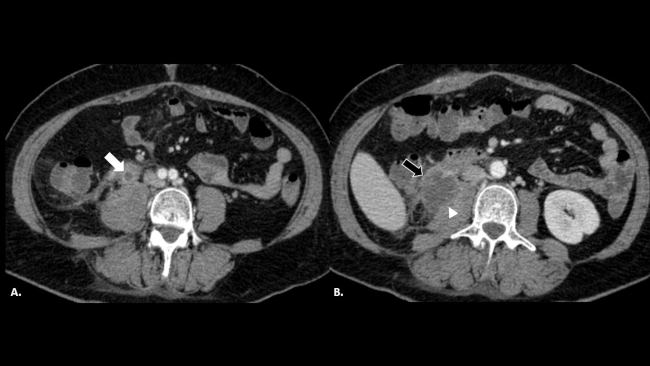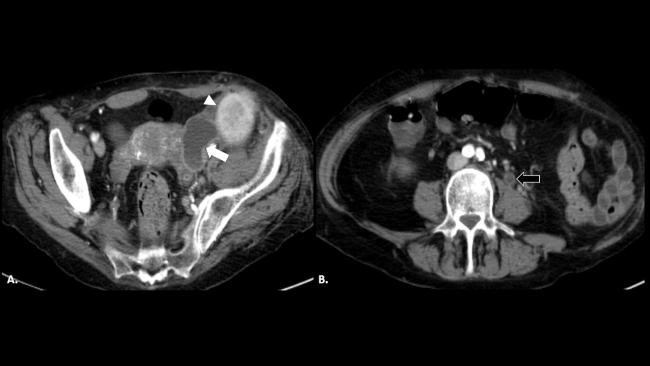 TC de abdomen con contrate endovenoso donde se observa en (a) uréter remanente derecho dilatado, con cambios inflamatorios adyacentes (flecha blanca). (b) Colección organizada originada en el extremo caudal del uréter remanente (flecha negra), con afectación del músculo psoas homolateral (cabeza de flecha).