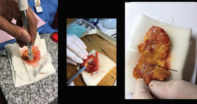 Labor del patólogo. (A) Utilización de la sonda de gamma probe para localizar la semilla en el segmento. (B y C) Sección para exponer la semilla (flecha).