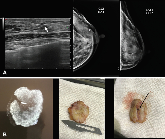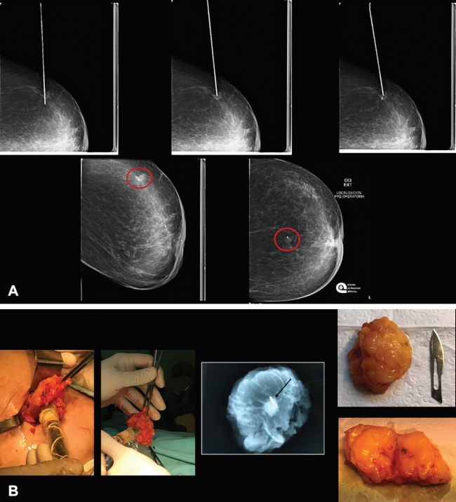 (A) Localización de nódulo con ecografía y mamografías de control. (B) Pieza operatoria.