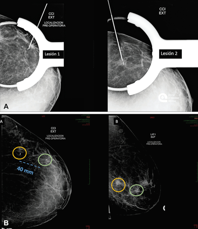 Semilla doble/paréntesis localizando dos nódulos en hora 3 de mama izq. (A) Control de las semillas liberadas(B) Mamografías para enviar a quirófano con las dos lesiones y respectivas semillas separadas por 40 mm.