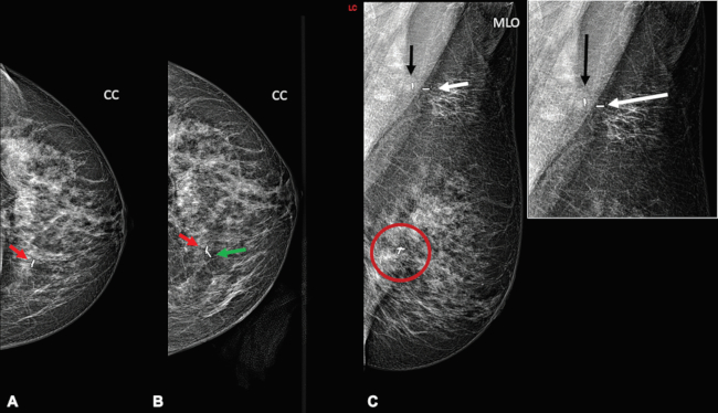 Semillas marcando clips en lesión y ganglio axilar izquierdos (A) CC, clip en lesión biopsiada con US (flecha roja); (B) CC, semilla marcando el clip (flecha verde); (C) MLO, semilla (flecha blanca) y clip (flecha negra) en ganglio axilar biopsiado.