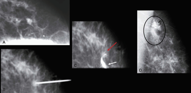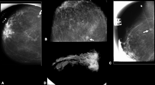 Primera localización con alambre en ciudad de Rosario, en el año 1984. (A) Lateral. (B) Cráneo-caudal con nódulo espiculado en cuadrante supero externo de la mama derecha (flechas blancas). (C) Ingreso en cráneo-caudal, alambre con su extremo en el nódulo (flecha blanca). (D) Radiografía con todo el alambre incluido en el segmento resecado.