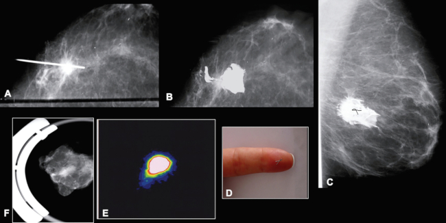 ROLL localizando un nódulo en hora 3 de mama izquierda, Rosario año 2004. (A) Inyección de solución de Tc99 y medio de contraste iodado. (B) Craneocaudal. (C) Lateral con la solución difundiendo alrededor de la lesión (oculta por el contraste), proyección del micro-arpón. (D) Micro arpón, (E y F) centellograma y radiografía del segmento resecado.
