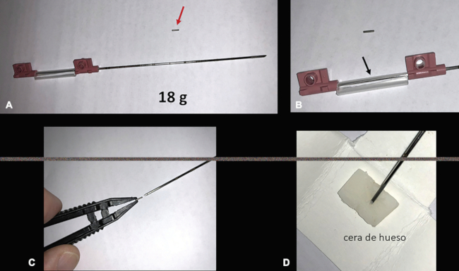 (A) Semilla y aguja 18 gauge. (B) Tubo plástico limitando el trayecto del mandril (flecha). (C) Inserción de la semilla. (D) Tapón del extremo de la aguja con cera de hueso estéril.