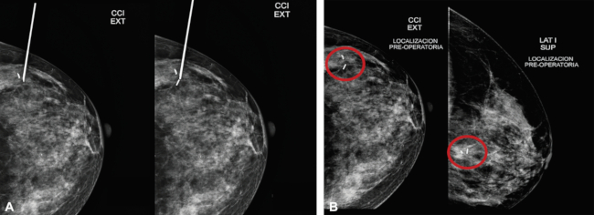 (A) Localización de microcalcificaciones remanentes en vecindad de clip post-biopsia. (B) Mamografías cráneocaudal y lateral adjuntadas para el quirófano.