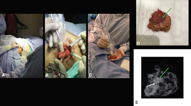 (A y B) Localización de la semilla con la sonda gamma. (C) Control de la actividad de la semilla en el segmento. (D) Volumen de la resección. (E) Radiografía del segmento con el clip post biopsia (flecha blanca) y semilla (flecha verde).