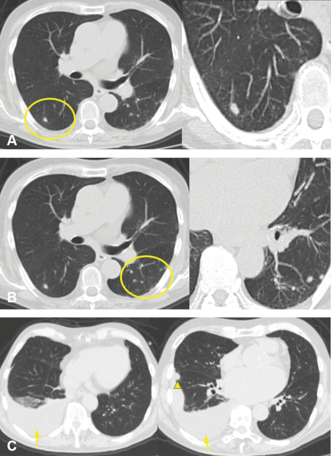 Síndrome hipereosinofílico. TCMD de tórax en plano axial (A, B) con zoom en zona de interés, que evidencia múltiples formaciones nodulares/nodulillares sólidas en ambos lóbulos inferiores (círculo) en contexto de paciente con diagnóstico clínico de síndrome hipereosinofílico. (C) Mismo paciente con otra intercurrencia, con derrame pleural (flecha) y engrosamientos pleurales focales y nodulares (cabeza de flecha).