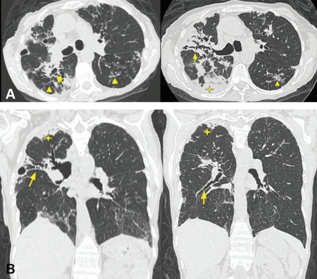 Aspergilosis broncopulmonar alérgica. TCMD de tórax en plano axial (A) y plano coronal (B). Múltiples bronquiectasias en ambos lóbulos superiores (flecha) asociadas a infiltrados nodulillares con patrón en árbol en brote con compromiso de la pequeña vía aérea e impactaciones endobronquiales (cabeza de flecha). Opacidades subpleurales correspondientes a pequeñas zonas de atelectasia distal (estrella) en un paciente con diagnóstico de aspergilosis broncopulmonar alérgica.