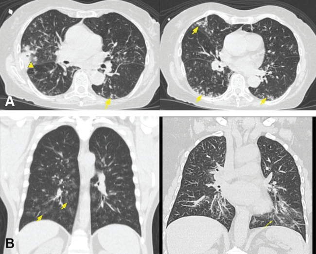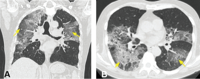 Granulomatosis con poliangeitis (GP). TCMD de tórax. Plano coronal (A) y plano axial (B). Múltiples áreas parcheadas de aumento en la atenuación del parénquima en vidrio esmerilado, con compromiso difuso de ambos campos pulmonares (flechas), en paciente con hioptisis y proteinuria. Los hallazgos del BAL son cambios inflamatorios con macrófagos con hiosiderina y eosinofilia moderada y el diagnóstico por biopsia renal es de granulomatosis con poliangeitis.