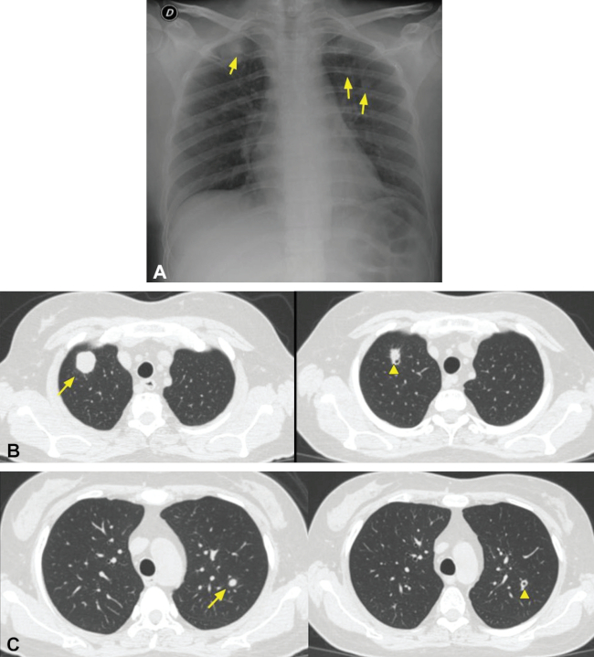 Granulomatosis con poliangeitis. Rx de tórax, incidencia anteroposterior (A). Opacidad nodular proyectada en el tercio superior del campo pulmonar derecho y otras más pequeñas y menos definidas en el izquierdo (flecha). TCMD de tórax plano axial (B, C) que evidencia dos formaciones nodulares en ambos campos pulmonares, que en los controles posteriores evolucionan a la cavidad central (cabeza de flecha).