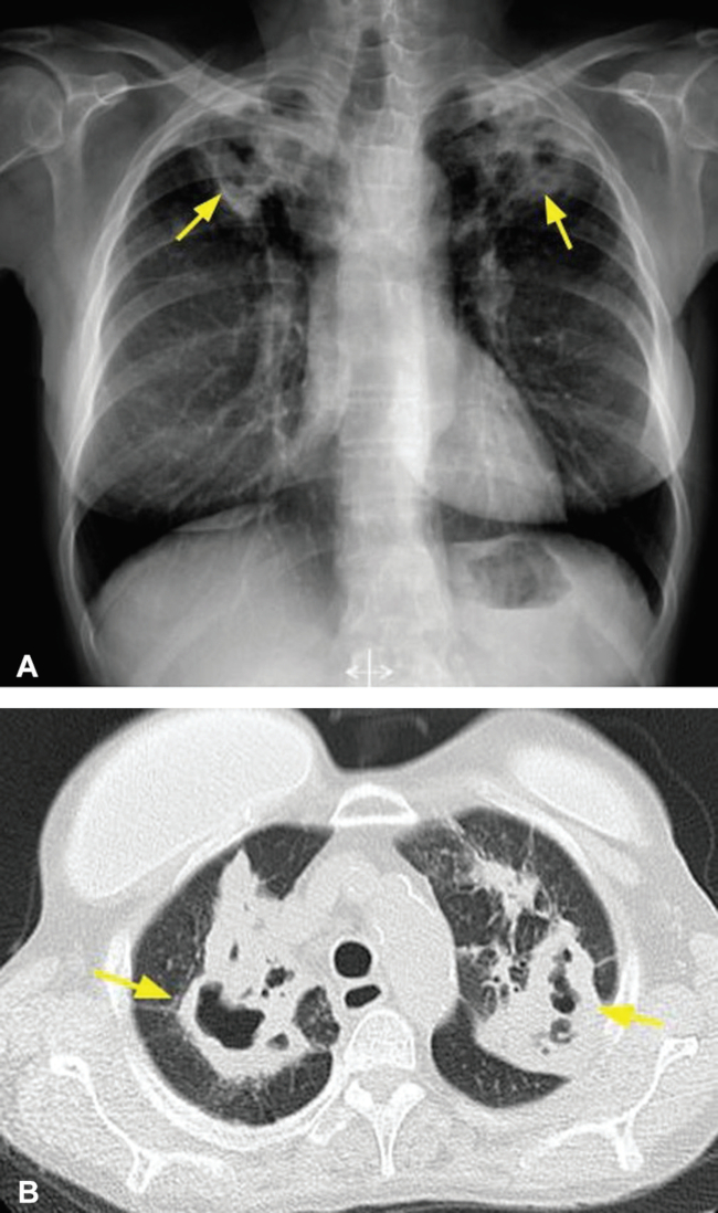 Granulomatosis Sarcoidea Necrosante. Paciente fienina de 40 años, asintomática desde la perspectiva respiratoria que concurre a control anual. Rx de tórax de incidencia anteroposterior (A). Áreas con marcada disminución en la transparencia en ambos lóbulos superiores con sectores con cavitación central (flecha). TCMD de tórax (B).