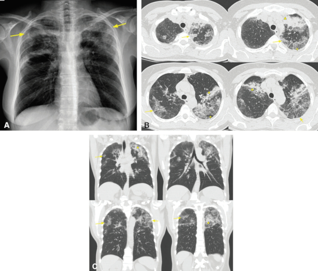 Neumonía eosinofílica aguda. Paciente de sexo fienino, 49 años de edad con antecedente de tos y síndrome febril. (A) Radiografía (Rx) de tórax incidencia anteroposterior, en la que se identifican áreas de disminución en la transparencia en el tercio superior de ambos campos pulmonares (flechas). TCMD de tórax en plano axial (B) y coronal (C), que diuestra múltiples áreas de aumento en la atenuación del parénquima pulmonar en vidrio esmerilado ambos lóbulos superiores (flechas), asociado a engrosamiento de los septos interlobulillares (estrella) y sectores sutiles con tendencia a la consolidación de distribución predominantiente subpleural (cabeza de flecha). Como compliento, el análisis de laboratorio arroja un resultado de 15.000 cel/mm3 de leucocitos con 34% de eosinófilos.