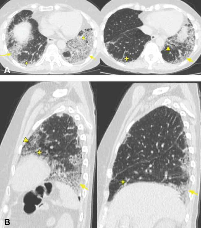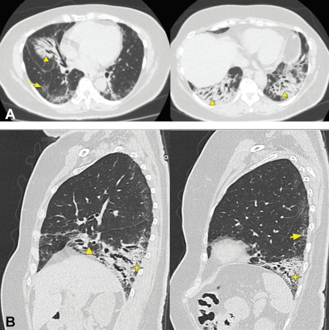 Síndrome de Sjögren. TCMD plano axial y sagital (A, B). Paciente fienina de 64 años, que presenta en contexto de síndrome de Sjögren intersticiopatía con múltiples áreas de aumento en la atenuación en vidrio esmerilado” de distribución peribroncovascular y subpleural (flechas) que comprometen principalmente a ambos lóbulos inferiores, lóbulo medio y língula y, en menor medida, a los sectores más basales de ambos lóbulos superiores. En esas áreas se identifican algunas dilataciones bronquiales/ bronquiolares (cabeza de flecha). En los segmentos basales de ambos lóbulos inferiores, especialmente del derecho, se identifican algunas áreas con tendencia a la consolidación (estrella). Biopsia positiva para fibrosis e infiltrado linfocitario con eosinofilia.
