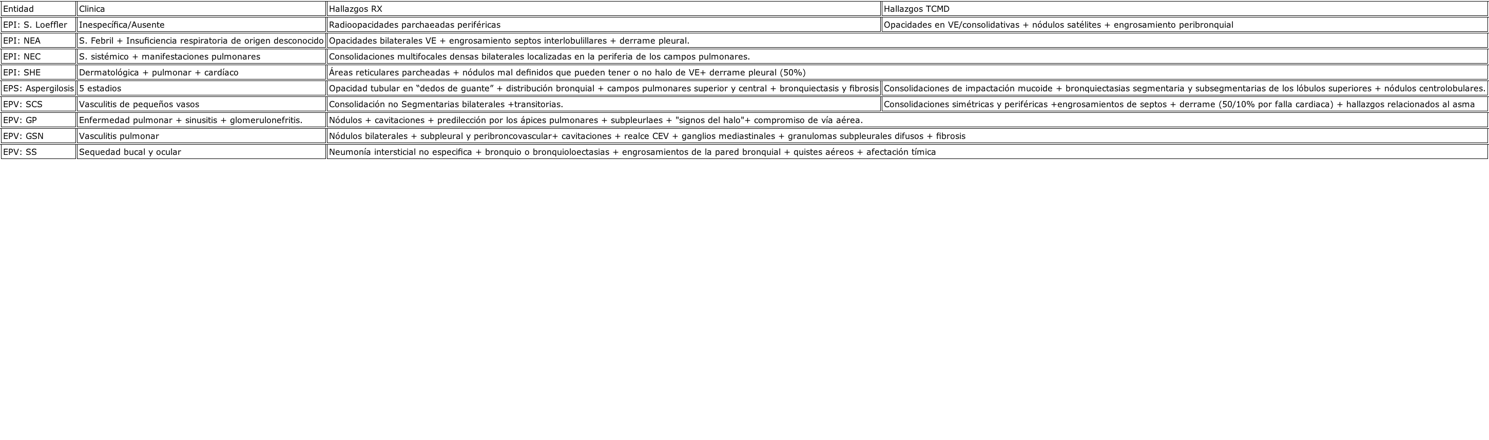Abstract: Pulmonary eosinophilias include a broad spectrum of disorders. Its definitive diagnosis is made with the pathological anatomy. However, through the clinical history, the physical examination and the images we can have access to a more precise definition of the pathology. Today, high resolution multislice computed tomography (MSCT) is the most sensitive and specific imaging method, allowing an accurate assessment of diffuse pulmonary pathology, thus avoiding the most invasive methods, providing detailed information and stating that lack a specific clinical expression by means of characteristic radiological patterns.