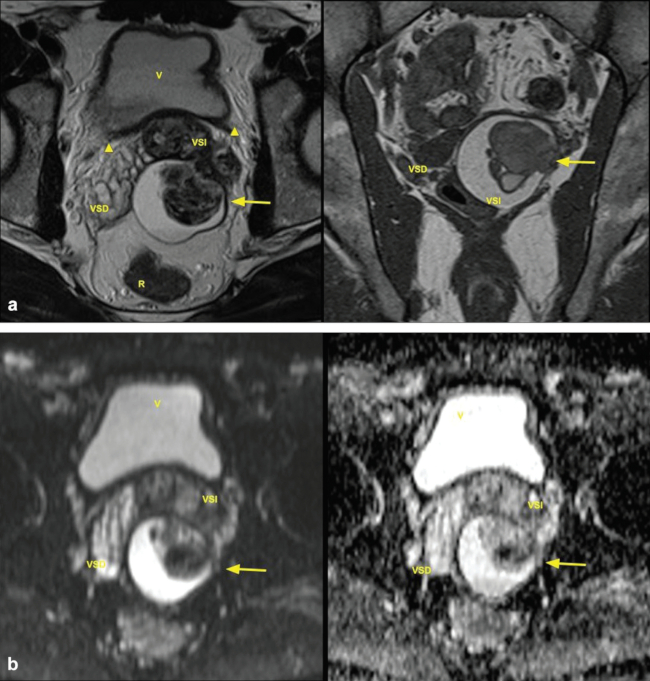 Resonancia magnética (RM) de vesículas seminales plano axial ponderado en T2 y coronal ponderado en T1(a), difusión por resonancia magnética sobre valor del coeficiente de difusión aparente (DWI/ADC) (b). Formación con componente quístico de contenido hemorrágico/proteico asociado a vegetación interna sólida, sin restricción celular (flecha) ni afectación de uréteres (cabeza de flecha). Abreviación: R, recto; V, vejiga; VSD, vesícula seminal derecha; VSI, vesícula seminal izquierda.
