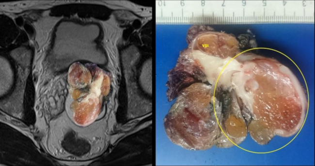 Presentamos el caso de un paciente masculino de 44 años, asintomático con único antecedente de episodio de peritonitis a los 10 años de edad. Fue derivado a nuestra institución por un hallazgo incidental en un estudio de ecografía vésico-prostática de control. Se decidió completar la caracterización realizando una RM de pelvis y vesículas seminales, en la que se reconoció una formación sólido-quística en la vesícula seminal izquierda, de bordes regulares, con componente quístico hiperintenso en secuencias ponderadas en T1 a expensas de contenido hemorrágico/proteico, asociado a formación vegetante interna sólida. Esas características son atribuibles a una neoplasia de origen estromal (►Figs.1 and 2). El abordaje quirúrgico y el análisis anatomopatológico posterior definieron la presencia de un cistoadenoma de vesícula seminal izquierda (►Fig. 3), sin secundarismo identificable en estudios de extensión.