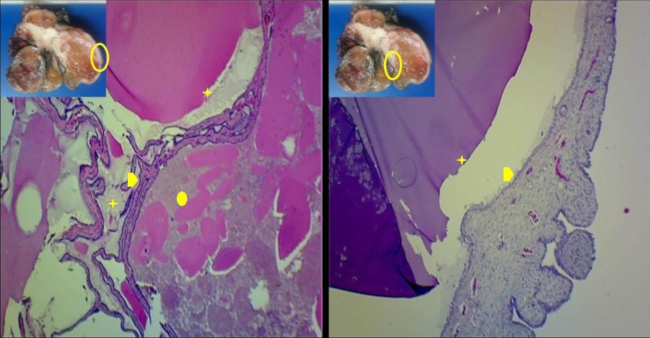 Microscopía. Tinción H-E x4. Proliferación tumoral constituida por múltiples formaciones quísticas y glandulares (estrella), tapizadas por pocas capas de células epiteliales cúbicas o cilíndricas (cabeza de flecha) y cantidad variable de estroma (círculo).