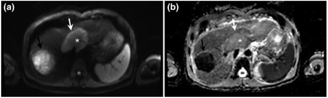 En estudios con secuencias de DWI la mayoría de los CC son marcadamente hiperintensos en comparación con el parénquima hepático normal adyacente. Un estudio evidenció que los valores de ADC de los CC fueron menores que los valores de ADC del parénquima hepático normal [(1,042 10 -3 mm2/s ± 0,2210 -3 mm2/s) vs (1,362 10 -3 mm2/s ± 0,187 10 -3 mm2/s) (p < 0,0001)].14