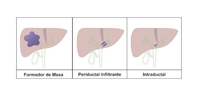 En la década de 1990, el Liver Cancer Study Group of Japan propuso clasificar los CC según el patrón de crecimiento del tumor (Fig. 7) en: formador de masa, periductal infiltrante e intraductal, debido a que la morfología permite una mejor interpretación radiológica, además de ser un indicador importante del comportamiento de la neoplasia, determinando el pronóstico y el enfoque terapéutico que se le dará.7,8