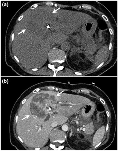 Además, se ha visto que el patrón de realce depende en cierto grado del tamaño del tumor. Por ejemplo, los tumores menores de 1 cm de diámetro pueden demostrar realce homogéneo, simulando un HCC. La demostración de lavado en la fase venosa y tardía presente en los carcinomas hepatocelulares ayudaría a diferenciarlo del CC.7,8