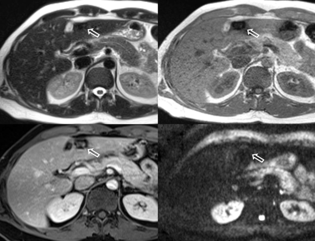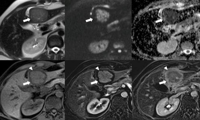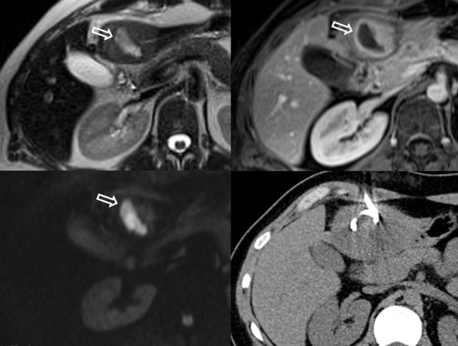 Se presenta el caso de un varón de 44 años de edad, que consultó por fiebre de origen desconocido de dos semanas de evolución. El laboratorio reveló un aumento de enzimas hepáticas e incremento en los reactantes de fase aguda. La fórmula leucocitaria se encontraba dentro de los normales. Con esos hallazgos se solicitó un ultrasonido, que reveló la presencia de una imagen hipoecoica de comportamiento expansivo en el segmento lateral del lóbulo hepático izquierdo. Se decidió avanzar en la caracterización mediante resonancia magnética (RM) de abdomen, donde se observó una imagen expansiva predominantemente sólida con un área central líquida. El componente sólido se mostraba levemente hipointenso en imagen ponderada en T1, con realce arterial en las series post contraste y persistencia del realce en los cortes tardíos, observándose además un fino halo periférico que mostraba captación progresiva del medio de contraste, probablemente por fibrosis (►Fig. 1). El área central líquida se mostraba hiperintensa en imagen ponderada en T2 y DWI, con caída de la señal en el mapa ADC, atribuible a contenido purulento (►Fig. 2).
