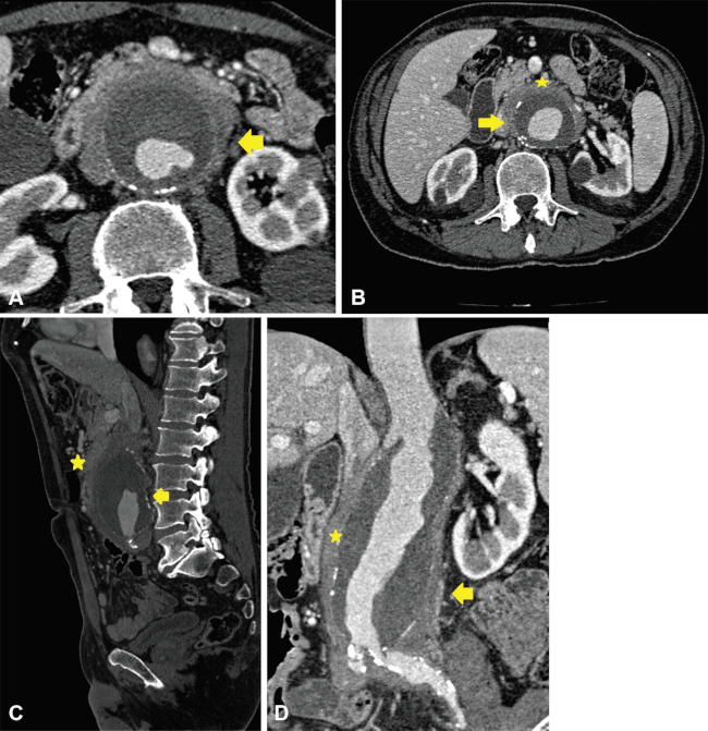 En la TCMD, se observan aneurismas con forma sacular en 90% de los casos y gas perianeurismático. Puede llegar a encontrarse destrucción vertebral, abscesos en el músculo psoas e infartos renales (►Fig. 6 and 7).1